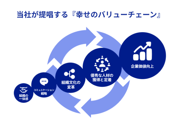 「幸せのバリューチェーン」とは、社員の一体感を起点とした成長のサイクルです。経営哲学やサービス品質、信頼、コミュニケーションなどの要素が結びつき、一体感を生み、困難を乗り越える原動力となります。